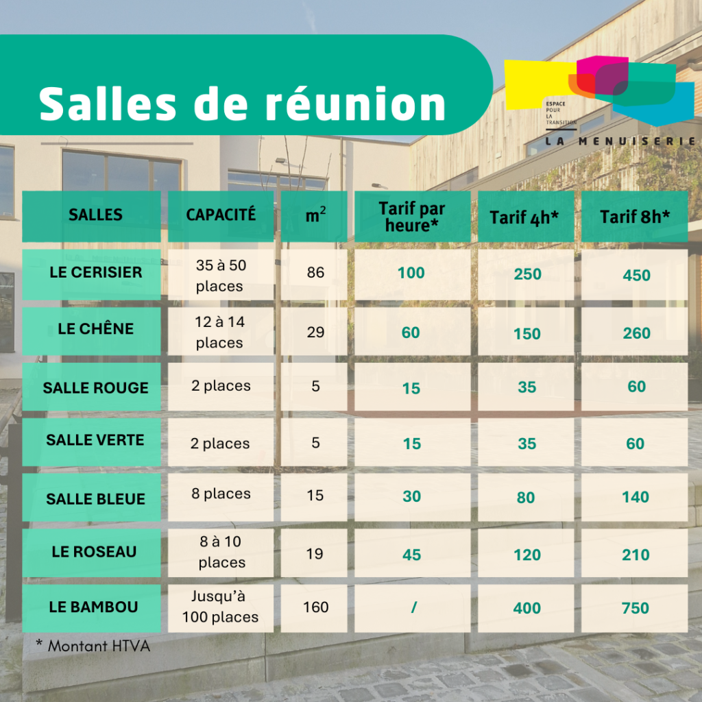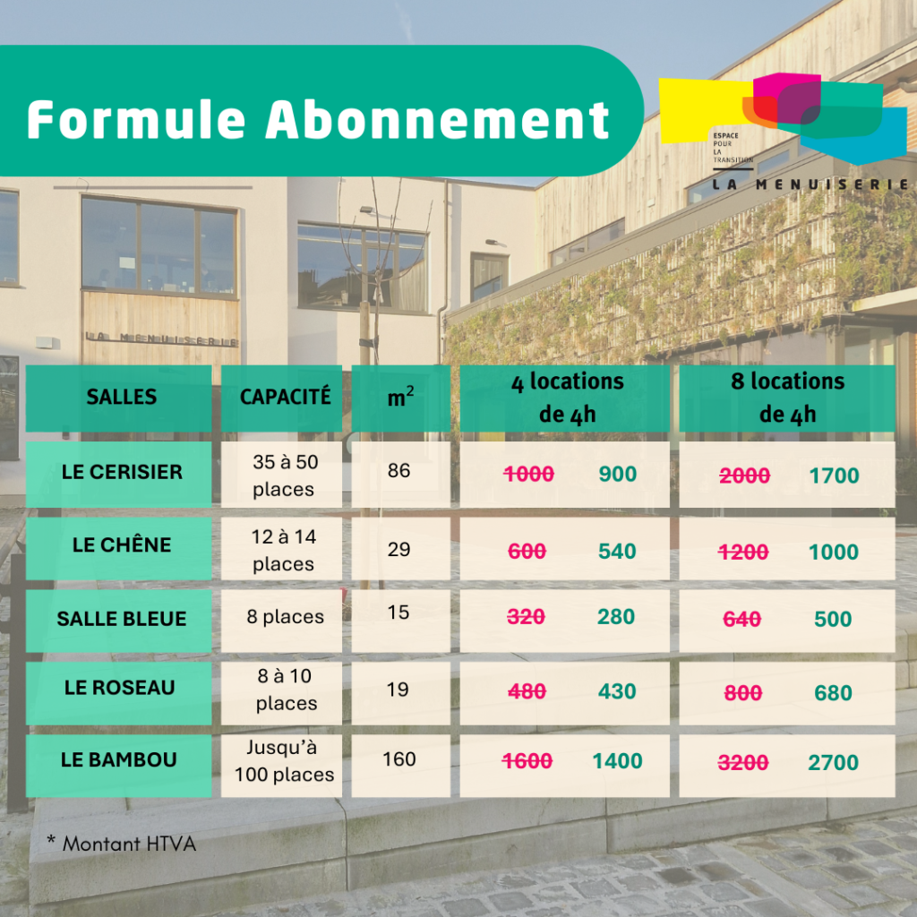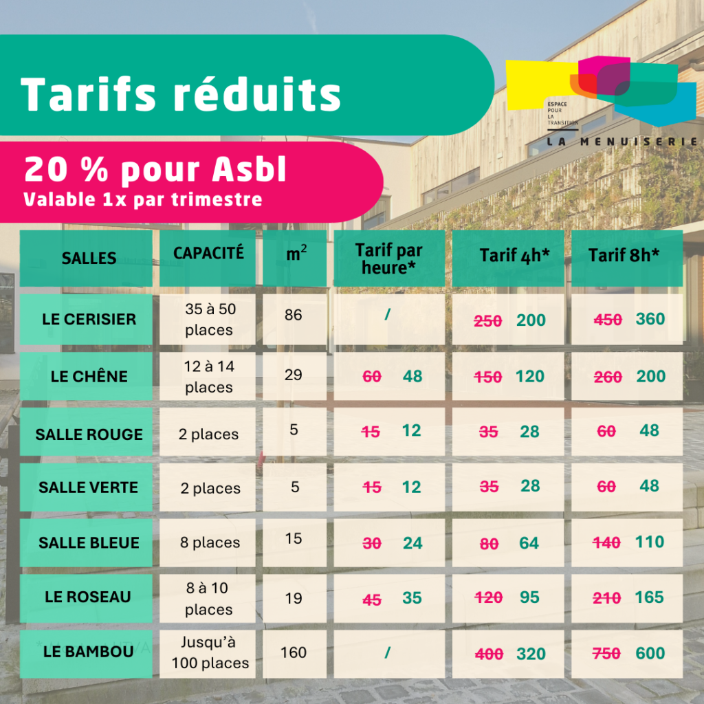 Vous êtes une petite Asbl ? LA MENUISERIE propose des tarifs réduits de 20% pour la location d’une salle chaque trimestre.